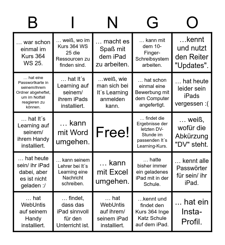 This bingo card has a free space and 24 words: … hat WebUntis auf seinem Handy installiert., … kann seinem Lehrer bei It´s Learning eine Nachricht schreiben., …weiß, wie man sich bei It´s Learning anmelden kann., …kennt und findet den Kurs 364 Inge Katz Schule auf dem iPad., …kennt und nutzt den Reiter "Updates"., … war schon einmal im Kurs 364 WS 25., … weiß, wo im Kurs 364 WS 25 die Ressourcen zu finden sind., … macht es Spaß mit dem iPad zu arbeiten., … findet die Ergebnisse der letzten DV-Stunde im passenden It´s Learning-Kurs., … weiß, wofür die Abkürzung "DV" steht., … hat It´s Learning auf seinem/ ihrem Handy installiert., … hat It´s Learning auf seinem/ ihrem iPads installiert., … hatte bisher immer ein geladenes iPad mit in der Schule., … kennt alle Passwörter für sein/ ihr iPad., … hat eine Passwortkarte in seinem/ihrem Ordner abgeheftet, um im Notfall reagieren zu können., … findet, dass das iPad sinnvoll für den Unterricht ist., … hat WebUntis auf ihrem/ seinem iPad installiert., … kann mit dem 10-Finger-Schreibsystem arbeiten., … hat heute leider sein iPads vergessen :(, … hat heute sein/ ihr iPad dabei, aber es ist nicht geladen :/, … kann mit Word umgehen., … kann mit Excel umgehen., … hat schon einmal eine Bewerbung mit dem Computer angefertigt. and ... hat ein Insta-Profil..
