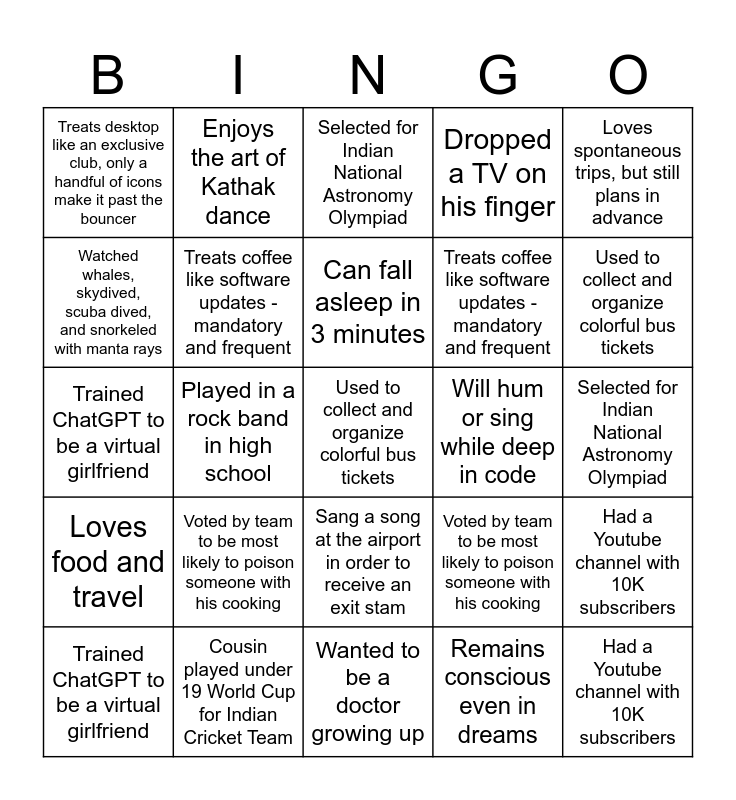 ⚠ This card has duplicate items: Used to draw sketches of people on trains (3), Played in a rock band in high school (3), Treats desktop like an exclusive club, only a handful of icons make it past the bouncer (3), Completed 3 full Marathon runs (3), Partner got driving license this month (3), Used to collect and organize colorful bus tickets (3), Loves food and travel (3), Remains conscious even in dreams (3), Voted by team to be most likely to poison someone with his cooking (3), Is a numismatist (3), Had a Youtube channel with 10K subscribers (3), Loves dancing to Bollywood dance numbers (3), Treats coffee like software updates - mandatory and frequent (3), Selected for Indian National Astronomy Olympiad (3), Owns a collection of over 100 music records/vinyls (3), Has 6 closets brimming with clothes (2), Trained ChatGPT to be a virtual girlfriend (2), When deeply focused, tends to ignore people (2), Once slept for 17 hours without waking up once (2), Got driving license at US, after failing 2 times (2), Cannot sit still if there is even a bit of mess (2), Can do headstand and scorpion pose (2), Cousin played under 19 World Cup for Indian Cricket Team (2), Wanted to be a trekking guide growing up (2), Sang a song at the airport in order to receive an exit stam (2)