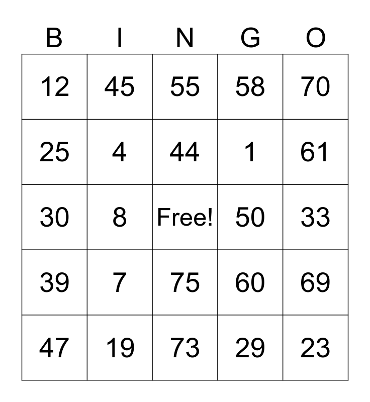 This bingo card has a free space and 24 words: 7, 19, 44, 47, 70, 12, 25, 45, 50, 75, 1, 30, 60, 69, 4, 29, 33, 55, 61, 8, 23, 39, 58 and 73.
