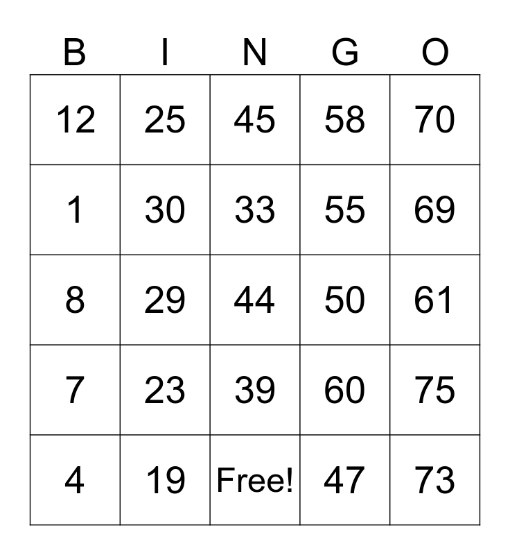This bingo card has 25 words: 7, 19, 44, 47, 70, 12, 25, 45, 50, 75, 1, 30, Free!, 60, 69, 4, 29, 33, 55, 61, 8, 23, 39, 58 and 73.