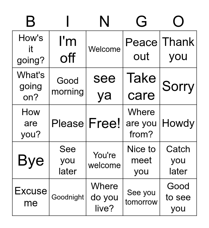This bingo card has a free space and 29 words: Excuse me, What's your name?, Please, What's up?, How's it going?, Welcome, Good morning, See you later, Where are you from?, Goodnight, Howdy, Good to see you, Where do you live?, See you tomorrow, Sorry, Have a nice day, You're welcome, Bye, Thank you, How are you?, Nice to meet you, How do you do?, Take care, What's going on?, Peace out, I'm off, Catch you later, see ya and Later.
