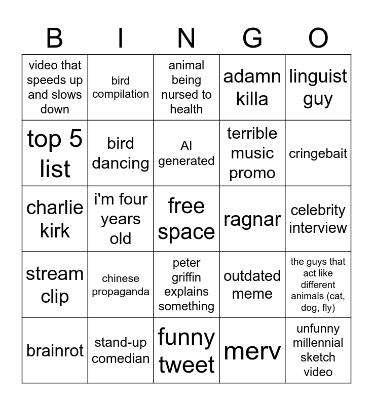 This bingo card has a free space and 24 words: chinese propaganda, stand-up comedian, AI generated, brainrot, linguist guy, video that speeds up and slows down, top 5 list, bird compilation, ragnar, peter griffin explains something, terrible music promo, charlie kirk, outdated meme, the guys that act like different animals (cat, dog, fly), bird dancing, merv, celebrity interview, animal being nursed to health, cringebait, i'm four years old, unfunny millennial sketch video, stream clip, adamn killa and funny tweet.