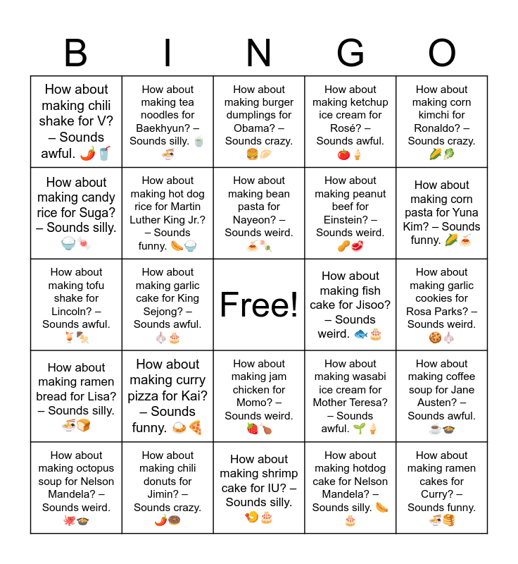 This bingo card has a free space and 33 words: How about making kimchi ice cream for Jungkook? – Sounds crazy. 🥬🍦, How about making burger rice for Son Heung-min? – Sounds funny. 🍔🍚, How about making garlic cake for King Sejong? – Sounds awful. 🧄🎂, How about making squid pizza for IU? – Sounds weird. 🦑🍕, How about making ramen bread for Lisa? – Sounds silly. 🍜🍞, How about making hot dog rice for Martin Luther King Jr.? – Sounds funny. 🌭🍚, How about making corn kimchi for Ronaldo? – Sounds crazy. 🌽🥬, How about making octopus soup for Nelson Mandela? – Sounds weird. 🐙🍲, How about making tea noodles for Baekhyun? – Sounds silly. 🍵🍜, How about making bacon rice for Michael Jordan? – Sounds funny. 🥓🍚, How about making bean pasta for Nayeon? – Sounds weird. 🍝🍡, How about making burger dumplings for Obama? – Sounds crazy. 🍔🥟, How about making mustard ice cream for RM? – Sounds awful. 🌭🍦, How about making choco bread for Gandhi? – Sounds silly. 🍫🍞, How about making fish cake for Jisoo? – Sounds weird. 🐟🎂, How about making corn pasta for Yuna Kim? – Sounds funny. 🌽🍝, How about making chili donuts for Jimin? – Sounds crazy. 🌶️🍩, How about making tofu shake for Lincoln? – Sounds awful. 🍹🍢, How about making curry pizza for Kai? – Sounds funny. 🍛🍕, How about making wasabi ice cream for Mother Teresa? – Sounds awful. 🌱🍦, How about making jam chicken for Momo? – Sounds weird. 🍓🍗, How about making kimchi tacos for Messi? – Sounds crazy. 🌮🥬, How about making chili shake for V? – Sounds awful. 🌶️🥤, How about making garlic cookies for Rosa Parks? – Sounds weird. 🍪🧄, How about making shrimp cake for IU? – Sounds silly. 🍤🎂, How about making ramen cakes for Curry? – Sounds funny. 🍜🥞, How about making ketchup ice cream for Rosé? – Sounds awful. 🍅🍦, How about making peanut beef for Einstein? – Sounds weird. 🥜🥩, How about making candy rice for Suga? – Sounds silly. 🍚🍬, How about making coffee soup for Jane Austen? – Sounds awful. ☕🍲, How about making burger ice cream for Michael Jackson? – Sounds crazy. 🍔🍦, How about making hotdog cake for Nelson Mandela? – Sounds silly. 🌭🎂 and How about making seaweed shake for Jin? – Sounds weird. 🌿🥤.
