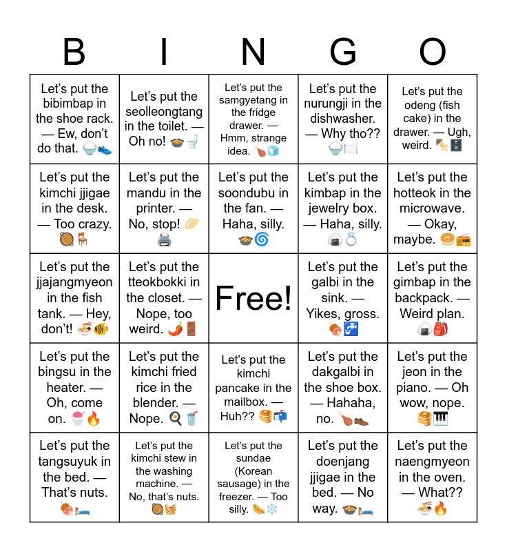 This bingo card has a free space and 30 words: Letโs put the kimchi stew in the washing machine. โ No, thatโs nuts. ๐ฅ๐งบ, Letโs put the bulgogi in the bathtub. โ Why?? ๐๐, Letโs put the tteokbokki in the closet. โ Nope, too weird. ๐ถ๏ธ๐ช, Letโs put the japchae in the toaster. โ No way! ๐๐, Letโs put the bibimbap in the shoe rack. โ Ew, donโt do that. ๐๐, Letโs put the samgyetang in the fridge drawer. โ Hmm, strange idea. ๐๐ง, Letโs put the mandu in the printer. โ No, stop! ๐ฅ๐จ๏ธ, Letโs put the kimchi pancake in the mailbox. โ Huh?? ๐ฅ๐ฌ, Letโs put the galbi in the sink. โ Yikes, gross. ๐๐ฐ, Letโs put the sundae (Korean sausage) in the freezer. โ Too silly. ๐ญโ๏ธ, Letโs put the gimbap in the backpack. โ Weird plan. ๐๐, Letโs put the naengmyeon in the oven. โ What?? ๐๐ฅ, Letโs put the doenjang jjigae in the bed. โ No way. ๐ฒ๐๏ธ, Letโs put the haemul pajeon in the lamp. โ Crazy idea. ๐ฅ๐ก, Letโs put the hotteok in the microwave. โ Okay, maybe. ๐ฅฏ๐ป, Letโs put the bossam in the trash can. โ Nooo! ๐ฅฉ๐๏ธ, Letโs put the dakgalbi in the shoe box. โ Hahaha, no. ๐๐, Letโs put the bingsu in the heater. โ Oh, come on. ๐ง๐ฅ, Letโs put the kimchi fried rice in the blender. โ Nope. ๐ณ๐ฅค, Letโs put the odeng (fish cake) in the drawer. โ Ugh, weird. ๐ข๐๏ธ, Letโs put the jjajangmyeon in the fish tank. โ Hey, donโt! ๐๐ , Letโs put the samgyeopsal in the backpack. โ Bad idea. ๐ฅ๐, Letโs put the seolleongtang in the toilet. โ Oh no! ๐ฒ๐ฝ, Letโs put the kimbap in the jewelry box. โ Haha, silly. ๐๐, Letโs put the kimchi jjigae in the desk. โ Too crazy. ๐ฅ๐ช, Letโs put the nurungji in the dishwasher. โ Why tho?? ๐๐ฝ๏ธ, Letโs put the jeon in the piano. โ Oh wow, nope. ๐ฅ๐น, Letโs put the tangsuyuk in the bed. โ Thatโs nuts. ๐๐๏ธ, Letโs put the soondubu in the fan. โ Haha, silly. ๐ฒ๐ and Letโs put the dakdoritang in the closet. โ Weird choice. ๐๐ช.