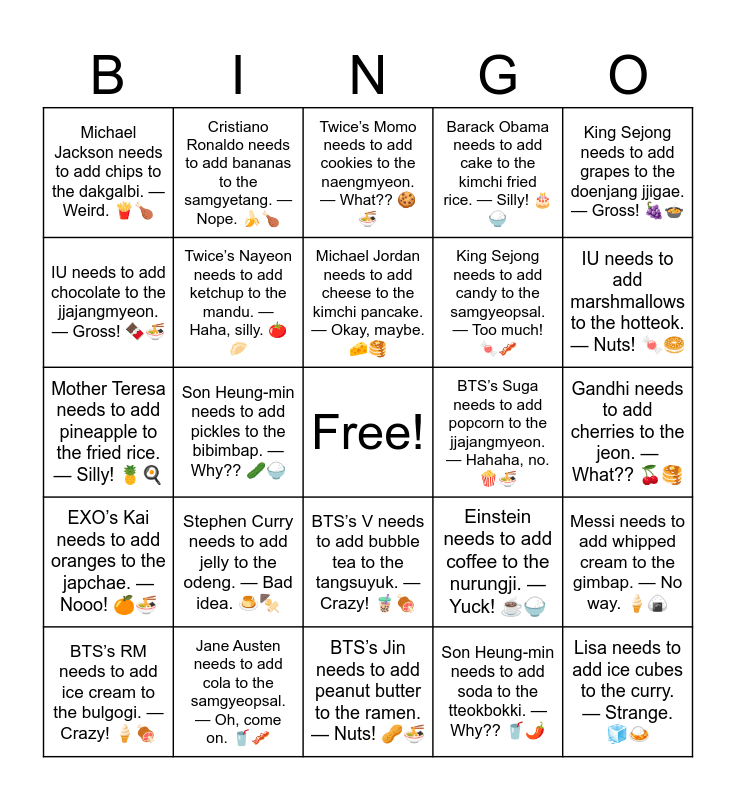 This bingo card has a free space and 33 words: BTSโs Jungkook needs to add chocolate to the kimchi stew. โ No way! ๐ซ๐ฅ, IU needs to add strawberries to the ramen. โ Thatโs nuts. ๐๐, Son Heung-min needs to add pickles to the bibimbap. โ Why?? ๐ฅ๐, Blackpinkโs Jisoo needs to add honey to the tteokbokki. โ Weird! ๐ฏ๐ถ๏ธ, EXOโs Kai needs to add oranges to the japchae. โ Nooo! ๐๐, Twiceโs Nayeon needs to add ketchup to the mandu. โ Haha, silly. ๐ ๐ฅ, King Sejong needs to add grapes to the doenjang jjigae. โ Gross! ๐๐ฒ, BTSโs RM needs to add ice cream to the bulgogi. โ Crazy! ๐ฆ๐, Cristiano Ronaldo needs to add bananas to the samgyetang. โ Nope. ๐๐, Blackpinkโs Rosรฉ needs to add peanut butter to the gimbap. โ Yikes! ๐ฅ๐, Michael Jordan needs to add cheese to the kimchi pancake. โ Okay, maybe. ๐ง๐ฅ, Twiceโs Momo needs to add cookies to the naengmyeon. โ What?? ๐ช๐, Yuna Kim needs to add jam to the sundae. โ Too weird. ๐๐ญ, Nelson Mandela needs to add lemon to the galbi. โ Hmm, strange. ๐๐, BTSโs Suga needs to add popcorn to the jjajangmyeon. โ Hahaha, no. ๐ฟ๐, IU needs to add marshmallows to the hotteok. โ Nuts! ๐ฌ๐ฅฏ, Jane Austen needs to add cola to the samgyeopsal. โ Oh, come on. ๐ฅค๐ฅ, Mother Teresa needs to add pineapple to the fried rice. โ Silly! ๐๐ณ, Stephen Curry needs to add jelly to the odeng. โ Bad idea. ๐ฎ๐ข, Einstein needs to add coffee to the nurungji. โ Yuck! โ๐, BTSโs V needs to add bubble tea to the tangsuyuk. โ Crazy! ๐ง๐, Rosa Parks needs to add sugar to the seolleongtang. โ Awful! ๐ฌ๐ฒ, Michael Jackson needs to add chips to the dakgalbi. โ Weird. ๐๐, Gandhi needs to add cherries to the jeon. โ What?? ๐๐ฅ, BTSโs Jin needs to add peanut butter to the ramen. โ Nuts! ๐ฅ๐, Lisa needs to add ice cubes to the curry. โ Strange. ๐ง๐, Barack Obama needs to add cake to the kimchi fried rice. โ Silly! ๐๐, King Sejong needs to add candy to the samgyeopsal. โ Too much! ๐ฌ๐ฅ, IU needs to add chocolate to the jjajangmyeon. โ Gross! ๐ซ๐, Messi needs to add whipped cream to the gimbap. โ No way. ๐ฆ๐, RM needs to add cookies to the doenjang jjigae. โ Nope. ๐ช๐ฒ, Son Heung-min needs to add soda to the tteokbokki. โ Why?? ๐ฅค๐ถ๏ธ and Blackpinkโs Jisoo needs to add fish to the hotteok. โ Yikes! ๐๐ฅฏ.