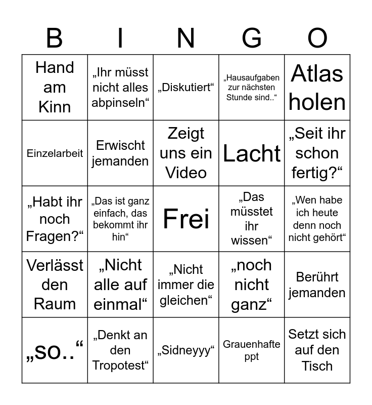 This bingo card has a free space and 24 words: „Nicht alle auf einmal“, „Denkt an den Tropotest“, Zeigt uns ein Video, „so..“, Atlas holen, Hand am Kinn, Einzelarbeit, „Ihr müsst nicht alles abpinseln“, „Das müsstet ihr wissen“, „Nicht immer die gleichen“, Lacht, „Habt ihr noch Fragen?“, „noch nicht ganz“, Berührt jemanden, Erwischt jemanden, Grauenhafte ppt, „Wen habe ich heute denn noch nicht gehört“, „Diskutiert“, „Seit ihr schon fertig?“, „Das ist ganz einfach, das bekommt ihr hin“, Setzt sich auf den Tisch, Verlässt den Raum, „Hausaufgaben zur nächsten Stunde sind..“ and „Sidneyyy“.