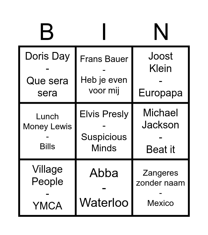 This bingo card has a free space and 8 words: Lunch Money Lewis - Bills, Frans Bauer - Heb je even voor mij, Michael Jackson - Beat it, Village People - YMCA, Joost Klein - Europapa, Doris Day - Que sera sera, Abba - Waterloo and Zangeres zonder naam - Mexico.