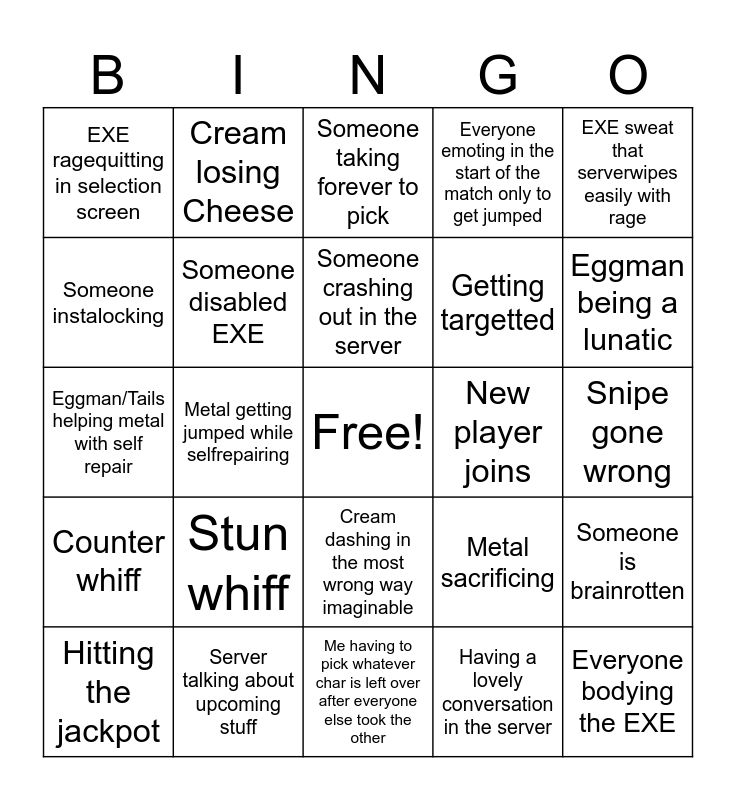 This bingo card has a free space and 24 words: Stun whiff, Server talking about upcoming stuff, Someone crashing out in the server, Hitting the jackpot, EXE sweat that serverwipes easily with rage, EXE ragequitting in selection screen, Someone instalocking, Cream losing Cheese, New player joins, Cream dashing in the most wrong way imaginable, Getting targetted, Eggman/Tails helping metal with self repair, Metal sacrificing, Someone is brainrotten, Someone disabled EXE, Having a lovely conversation in the server, Snipe gone wrong, Someone taking forever to pick, Eggman being a lunatic, Metal getting jumped while selfrepairing, Everyone bodying the EXE, Counter whiff, Everyone emoting in the start of the match only to get jumped and Me having to pick whatever char is left over after everyone else took the other.