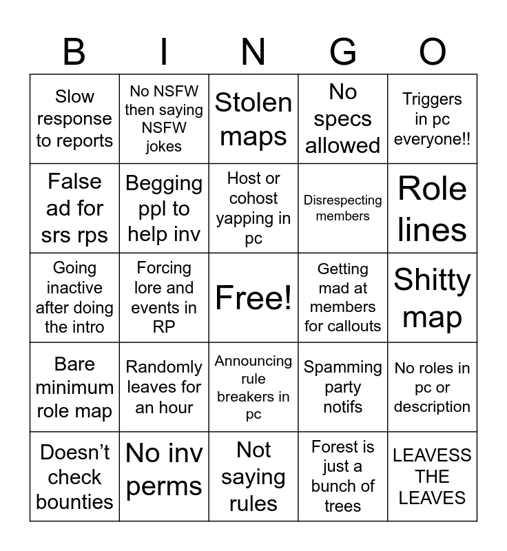 This bingo card has a free space and 24 words: Randomly leaves for an hour, No inv perms, Host or cohost yapping in pc, Doesn’t check bounties, Triggers in pc everyone!!, Slow response to reports, False ad for srs rps, No NSFW then saying NSFW jokes, Getting mad at members for callouts, Announcing rule breakers in pc, Disrespecting members, Going inactive after doing the intro, Spamming party notifs, No roles in pc or description, Begging ppl to help inv, Forest is just a bunch of trees, Shitty map, Stolen maps, Role lines, Forcing lore and events in RP, LEAVESS THE LEAVES, Bare minimum role map, No specs allowed and Not saying rules.