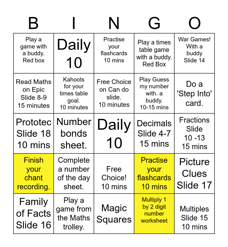 This bingo card has 25 words: Complete a number of the day sheet., Magic Squares, Free Choice on Can do slide. 10 minutes, Family of Facts Slide 16, War Games! With a buddy Slide 14, Play a game with a buddy. Red box, Read Maths on Epic Slide 8-9 15 minutes, Daily 10, Decimals Slide 4-7 15 mins, Free Choice! 10 mins, Play Guess my number with. a buddy. 10-15 mins, Prototec Slide 18 10 mins, Practise your flashcards 10 mins, Picture Clues Slide 17, Kahoots for your times table goal. 10 minutes, Multiples Slide 15 10 mins, Fractions Slide 10 -13 15 mins, Practise your flashcards 10 mins, Do a 'Step Into' card., Number bonds sheet., Daily 10, Play a game from the Maths trolley., Finish your chant recording., Play a times table game with a buddy. Red Box and Multiply 1 by 2 digit number worksheet.