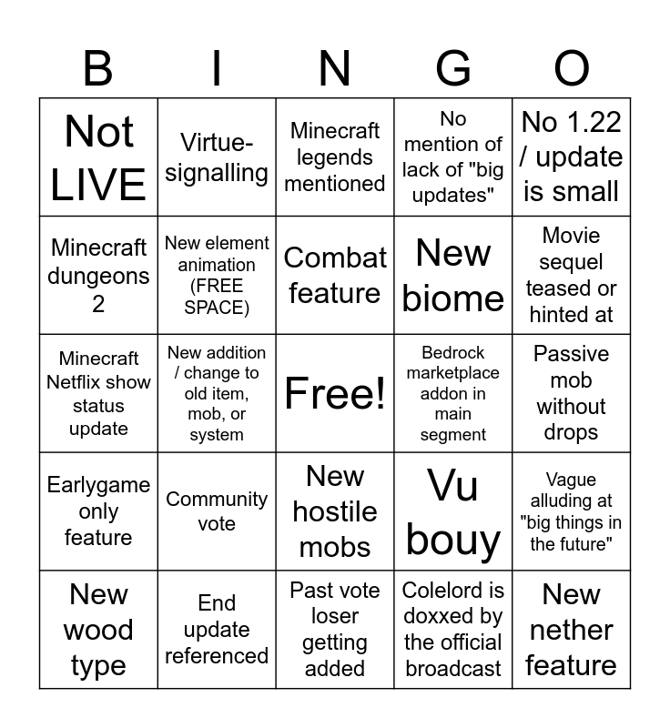 This bingo card has a free space and 25 words: Community vote, Past vote loser getting added, Combat feature, New wood type, No 1.22 / update is small, Not LIVE, Minecraft dungeons 2, Virtue-signalling, Bedrock marketplace addon in main segment, New hostile mobs, New biome, Minecraft Netflix show status update, Vu bouy, Vague alluding at "big things in the future", New element animation (FREE SPACE), Agnes almost cries, Passive mob without drops, Minecraft legends mentioned, Movie sequel teased or hinted at, New addition / change to old item, mob, or system, New nether feature, End update referenced, Earlygame only feature, No mention of lack of "big updates" and Colelord is doxxed by the official broadcast.