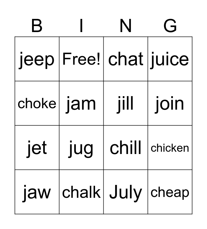 This bingo card has 32 words: chain, cheery, chicken, chip, cheap, jill, choke, chest, Free!, Jane, join, chat, jump, jungle, chalk, chop, jelly, chill, cheer, Jew, cheese, Chad, July, chew, jaw, juice, jet, jam, jeep, chair, jeans and jug.
