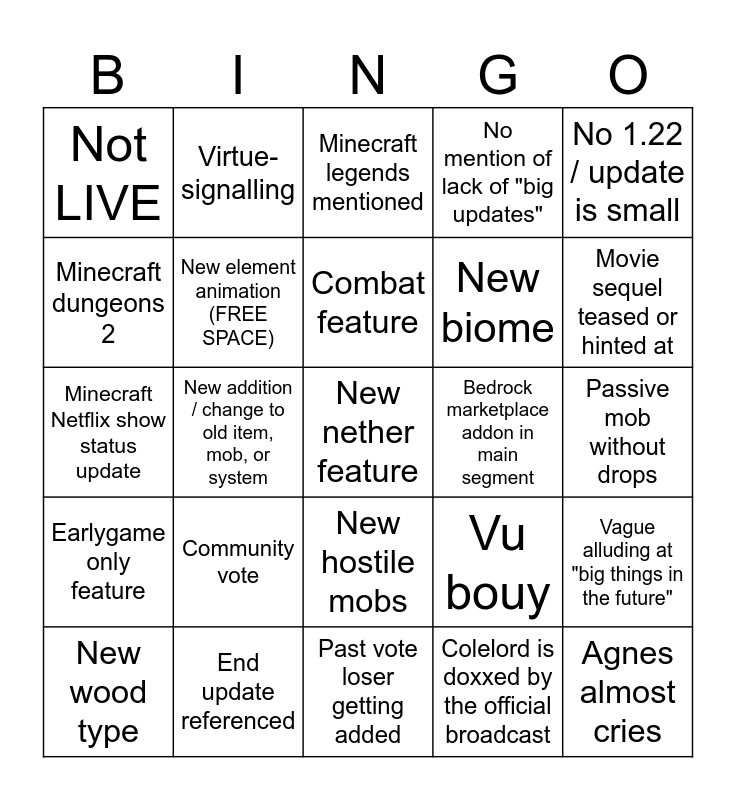 This bingo card has 25 words: Community vote, Past vote loser getting added, Combat feature, New wood type, No 1.22 / update is small, Not LIVE, Minecraft dungeons 2, Virtue-signalling, Bedrock marketplace addon in main segment, New hostile mobs, New biome, Minecraft Netflix show status update, Vu bouy, Vague alluding at "big things in the future", New element animation (FREE SPACE), Agnes almost cries, Passive mob without drops, Minecraft legends mentioned, Movie sequel teased or hinted at, New addition / change to old item, mob, or system, New nether feature, End update referenced, Earlygame only feature, No mention of lack of "big updates" and Colelord is doxxed by the official broadcast.