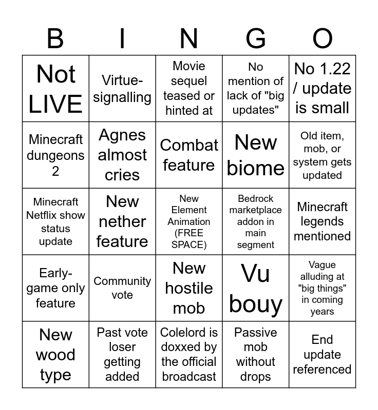 This bingo card has a free space and 24 words: Community vote, Past vote loser getting added, Combat feature, New wood type, No 1.22 / update is small, Not LIVE, Minecraft dungeons 2, Virtue-signalling, Bedrock marketplace addon in main segment, New hostile mob, New biome, Minecraft Netflix show status update, Vu bouy, Vague alluding at "big things" in coming years, Agnes almost cries, Passive mob without drops, Minecraft legends mentioned, Movie sequel teased or hinted at, Old item, mob, or system gets updated, New nether feature, End update referenced, Early-game only feature, No mention of lack of "big updates" and Colelord is doxxed by the official broadcast.