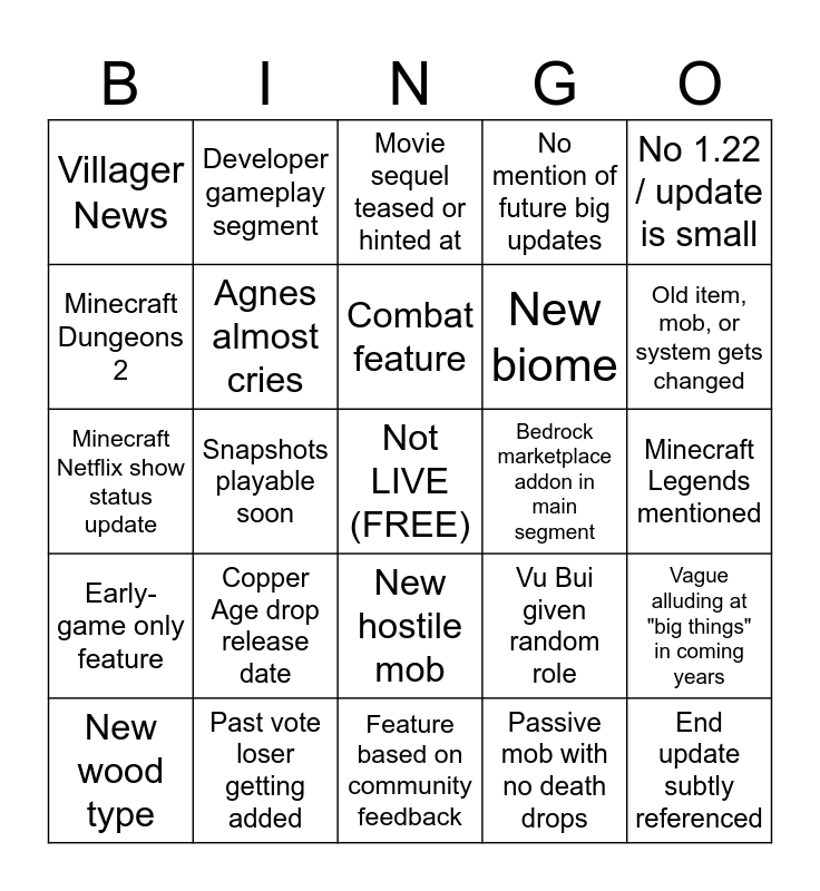 This bingo card has a free space and 24 words: Copper Age drop release date, Past vote loser getting added, Combat feature, New wood type, No 1.22 / update is small, Villager News, Minecraft Dungeons 2, Developer gameplay segment, Bedrock marketplace addon in main segment, New hostile mob, New biome, Minecraft Netflix show status update, Vu Bui given random role, Vague alluding at "big things" in coming years, Agnes almost cries, Passive mob with no death drops, Minecraft Legends mentioned, Movie sequel teased or hinted at, Old item, mob, or system gets changed, Snapshots playable soon, End update subtly referenced, Early-game only feature, No mention of future big updates and Feature based on community feedback.