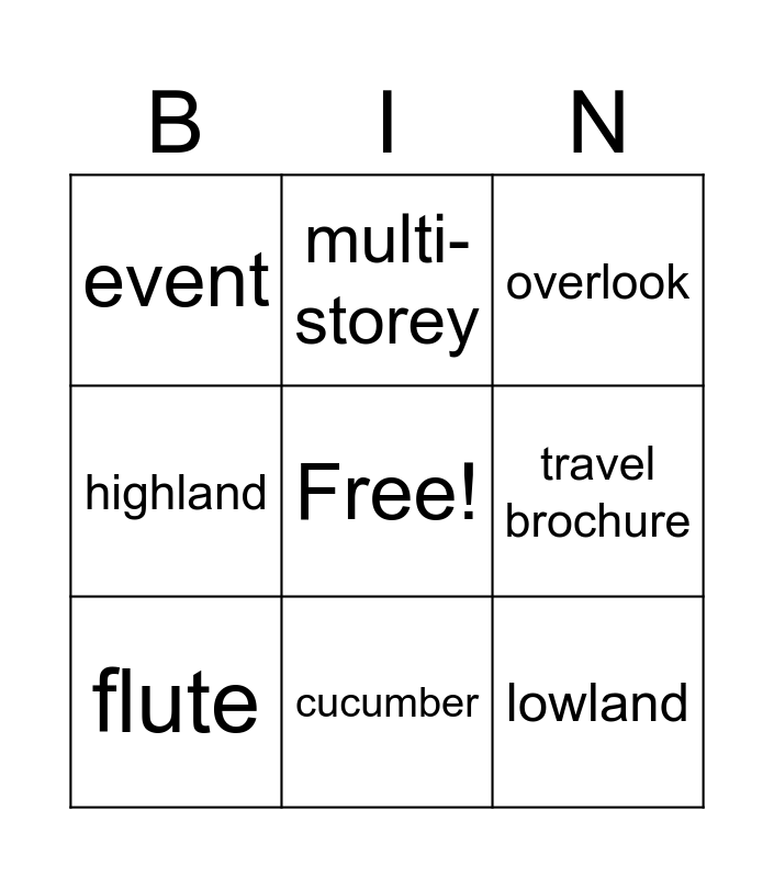 This bingo card has a free space and 8 words: travel brochure, overlook, multi-storey, flute, event, lowland, highland and cucumber.