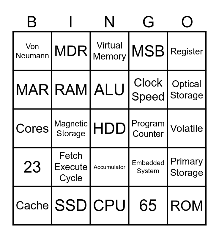 This bingo card has 25 words: Fetch Execute Cycle, CPU, ALU, Cache, Register, Von Neumann, MAR, MDR, Program Counter, Accumulator, Clock Speed, Cores, Embedded System, Primary Storage, RAM, ROM, Volatile, Virtual Memory, Optical Storage, Magnetic Storage, HDD, SSD, 23, MSB and 65.