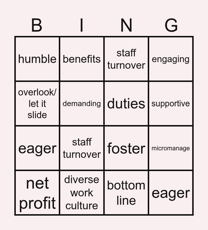 This bingo card has 19 words: foster, last but not least, staff turnover, eager, micromanage, overlook/ let it slide, bottom line, humble, benefits, eager, staff turnover, demanding, duties, diverse work culture, net profit, gross profit, engaging, supportive and amenities/ facilities.