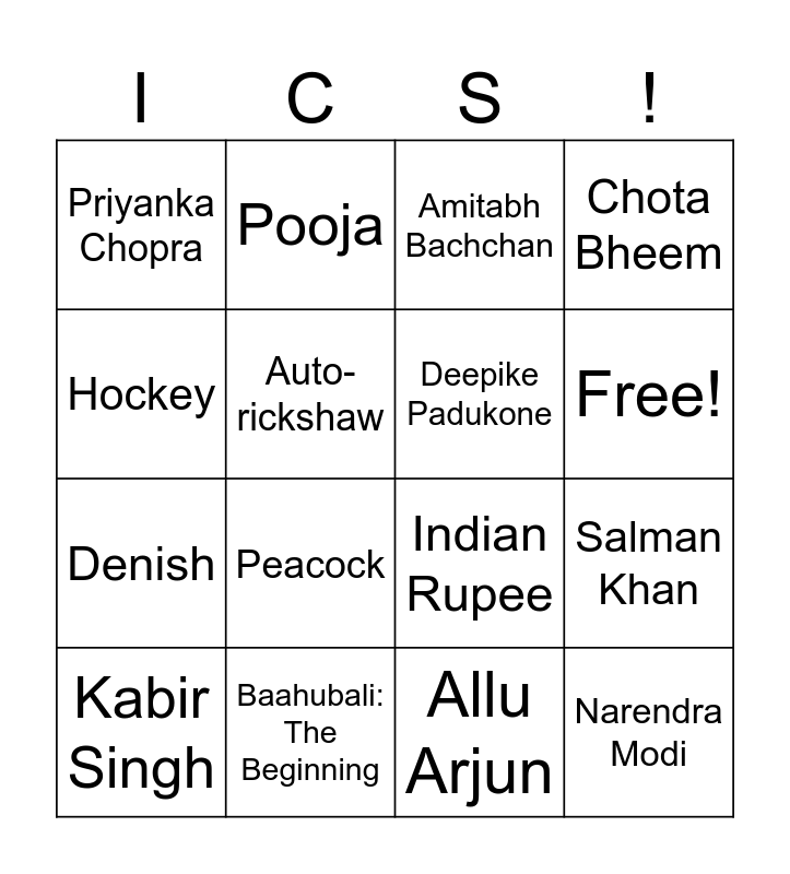 This bingo card has 29 words: SRK, LE, Salman Khan, Aamir Khan, Priyanka Chopra, Amitabh Bachchan, Deepike Padukone, Bikes, Baahubali: The Beginning, RRR, Allu Arjun, Kabir Singh, Saffron, White, Green, Mahatma Gandhi, Peacock, Diwali, Cricket, Narendra Modi, Hockey, Indian Rupee, Taj Mahal, Cultural, Denish, Auto-rickshaw, Chota Bheem, Pooja, Lotus, Free! and Sanya.