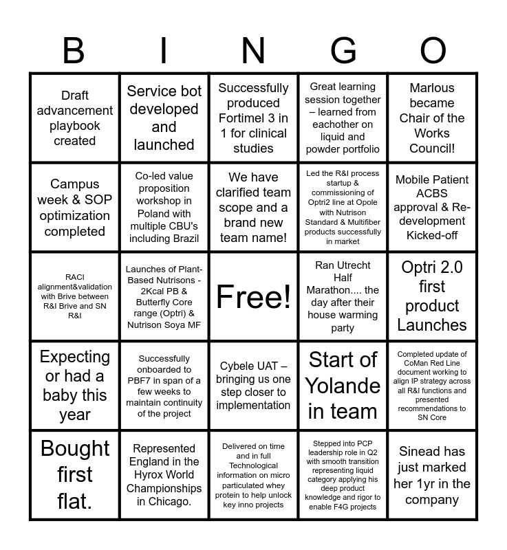 This bingo card has a free space and 42 words: Compact Protein Next Gen: Factory trial prepared & scheduled, We have clarified team scope and a brand new team name!, The full team managed to find Maaike’s house in Renswoude (middle of nowhere) without getting lost and all where in time!, Successfully onboarded to PBF7 in span of a few weeks to maintain continuity of the project, Stepped into PCP leadership role in Q2 with smooth transition representing liquid category applying his deep product knowledge and rigor to enable F4G projects, Completed update of CoMan Red Line document working to align IP strategy across all R&I functions and presented recommendations to SN Core, Sinead has just marked her 1yr in the company, First powdered version of Nutrison MF containing P4 produced in the pilot plant, Successfully produced Fortimel 3 in 1 for clinical studies, Cybele UAT – bringing us one step closer to implementation, Optri 2.0 first product Launches, Mobile Patient ACBS approval & Re-development Kicked-off, Launches of Plant-Based Nutrisons - 2Kcal PB & Butterfly Core range (Optri) & Nutrison Soya MF, Marlous became Chair of the Works Council!, Merel moved into her new home!, Start of Yolande in team, Final IT's Unidiet (transfer from Brive to 3PM), RACI alignment&validation with Brive between R&I Brive and SN R&I, Ali turning 50 (8-5-2025), Service bot developed and launched, Campus week & SOP optimization completed, PBF7/Compact Protein Vitamin D: 9 PDS released & counting, Launch of Compact Energy & Fortimel Energy Neutral from Luleburgaz, Draft advancement playbook created, Had a wedding, Successful reorganization with activities transfer, Led the R&I process startup & commissioning of Optri2 line at Opole with Nutrison Standard & Multifiber products successfully in market, Represented R&I presenting to Antoine de Saint-Affrique at Opole Optri2.0 line startup celebration, Completed Bingo Wave 1 PDS on time while identifying critical regulatory and quality improvements, Kavita bought a new house, Executing Actysin DOE for Fortimel Advanced in progress, Expecting or had a baby this year, Co-led value proposition workshop in Poland with multiple CBU's including Brazil, Delivered on time and in full Technological information on micro particulated whey protein to help unlock key inno projects, Co-led first XF biotics workshop dedicated to adult. To shape the future of biotics in SN Adult., Bought first flat., Represented England in the Hyrox World Championships in Chicago., Ran Utrecht Half Marathon.... the day after their house warming party, Ran Utrecht 10 km without any training in a good time when claiming 'they are not a runner', We have a fully staffed / complete team, Great learning session together – learned from eachother on liquid and powder portfolio and We have a rounded team (all insight colours represented) and gained understanding how we can leverage our strengths as team’.