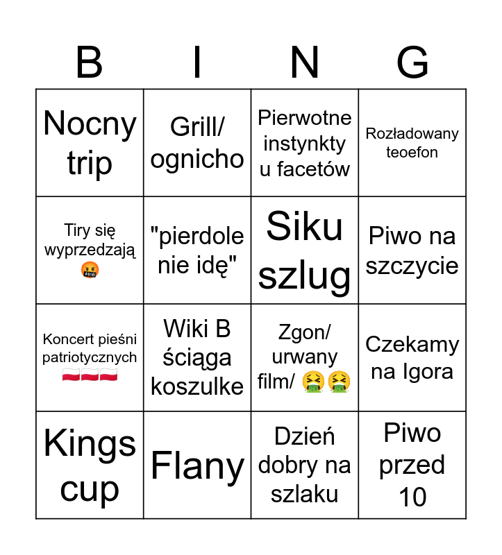This bingo card has 16 words: Flany, Czekamy na Igora, Pierwotne instynkty u facetów, Nocny trip, Koncert pieśni patriotycznych 🇵🇱🇵🇱🇵🇱, Grill/ ognicho, Zgon/ urwany film/ 🤮🤮, Dzień dobry na szlaku, Tiry się wyprzedzają 🤬, "pierdole nie idę", Kings cup, Rozładowany teoefon, Wiki B ściąga koszulke, Piwo na szczycie, Siku szlug and Piwo przed 10.