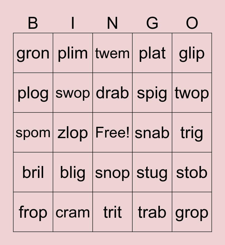 This bingo card has a free space and 24 words: blig, cram, drab, frop, glip, gron, plog, plim, snab, snop, spig, spom, stug, stob, swop, trab, trig, twem, twop, zlop, grop, bril, plat and trit.