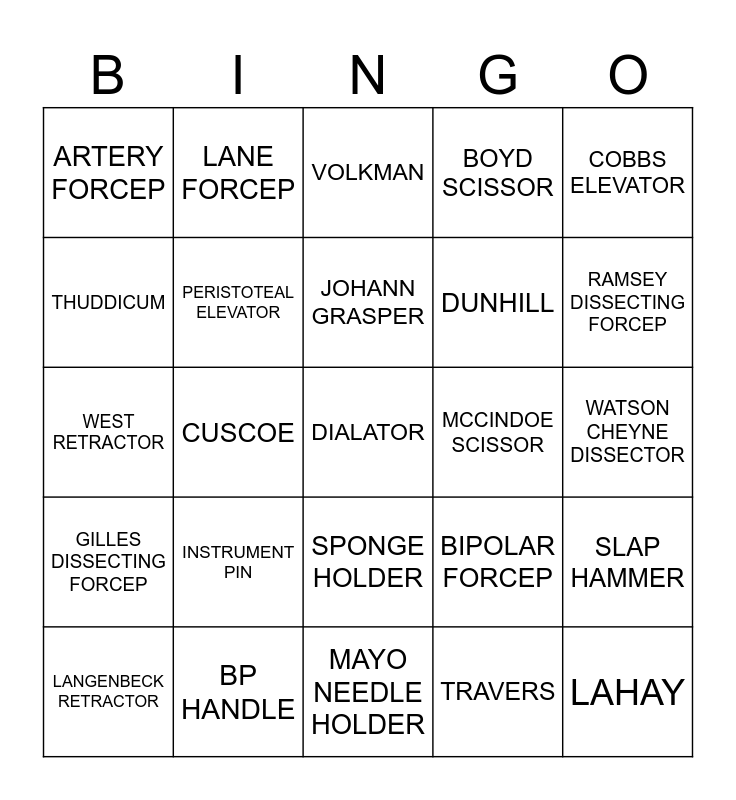 This bingo card has 25 words: INSTRUMENT PIN, MAYO NEEDLE HOLDER, JOHANN GRASPER, LANGENBECK RETRACTOR, COBBS ELEVATOR, ARTERY FORCEP, THUDDICUM, LANE FORCEP, MCCINDOE SCISSOR, SPONGE HOLDER, DUNHILL, WEST RETRACTOR, BIPOLAR FORCEP, SLAP HAMMER, PERISTOTEAL ELEVATOR, LAHAY, WATSON CHEYNE DISSECTOR, VOLKMAN, RAMSEY DISSECTING FORCEP, CUSCOE, DIALATOR, BP HANDLE, GILLES DISSECTING FORCEP, BOYD SCISSOR and TRAVERS.