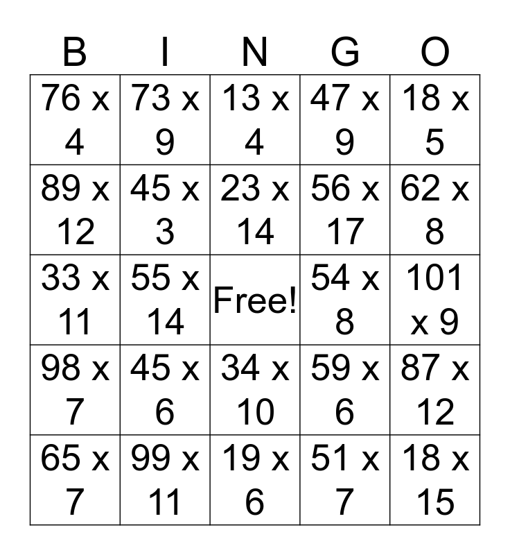 This bingo card has a free space and 24 words: 45 x 6, 99 x 11, 23 x 14, 65 x 7, 18 x 5, 76 x 4, 89 x 12, 73 x 9, 54 x 8, 34 x 10, 56 x 17, 33 x 11, 59 x 6, 87 x 12, 45 x 3, 51 x 7, 101 x 9, 13 x 4, 62 x 8, 55 x 14, 18 x 15, 98 x 7, 47 x 9 and 19 x 6.