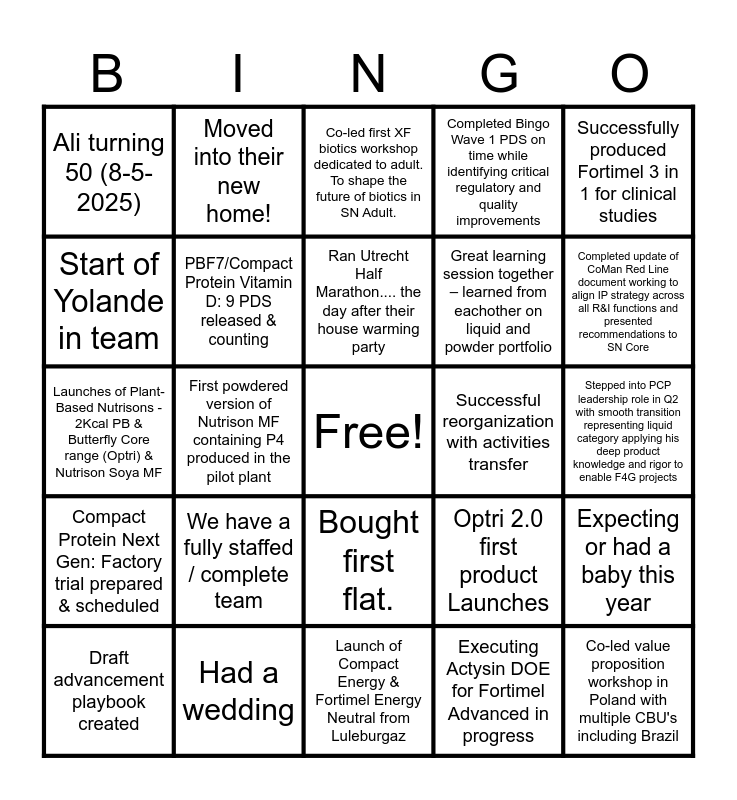 This bingo card has a free space and 42 words: Represented England in the Hyrox World Championships in Chicago., Ran Utrecht Half Marathon.... the day after their house warming party, Ran Utrecht 10 km without any training in a good time when claiming 'they are not a runner', We have a fully staffed / complete team, Executing Actysin DOE for Fortimel Advanced in progress, Expecting or had a baby this year, Co-led value proposition workshop in Poland with multiple CBU's including Brazil, Delivered on time and in full Technological information on micro particulated whey protein to help unlock key inno projects, Co-led first XF biotics workshop dedicated to adult. To shape the future of biotics in SN Adult., Bought first flat., Stepped into PCP leadership role in Q2 with smooth transition representing liquid category applying his deep product knowledge and rigor to enable F4G projects, Completed update of CoMan Red Line document working to align IP strategy across all R&I functions and presented recommendations to SN Core, First powdered version of Nutrison MF containing P4 produced in the pilot plant, Successfully produced Fortimel 3 in 1 for clinical studies, Cybele UAT – bringing us one step closer to implementation, Optri 2.0 first product Launches, Mobile Patient ACBS approval & Re-development Kicked-off, Launches of Plant-Based Nutrisons - 2Kcal PB & Butterfly Core range (Optri) & Nutrison Soya MF, Marlous became Chair of the Works Council!, Moved into their new home!, Start of Yolande in team, Final IT's Unidiet (transfer from Brive to 3PM), RACI alignment&validation with Brive between R&I Brive and SN R&I, Ali turning 50 (8-5-2025), Service bot developed and launched, Campus week & SOP optimization completed, Great learning session together – learned from eachother on liquid and powder portfolio, We have a rounded team (all insight colours represented) and gained understanding how we can leverage our strengths as team’, We have clarified team scope and a brand new team name!, The full team managed to find Maaike’s house in Renswoude (middle of nowhere) without getting lost and all where in time!, Sinead has just marked her 1yr in the company, Compact Protein Next Gen: Factory trial prepared & scheduled, PBF7/Compact Protein Vitamin D: 9 PDS released & counting, Launch of Compact Energy & Fortimel Energy Neutral from Luleburgaz, Kavita bought a new house, Draft advancement playbook created, Had a wedding, Successful reorganization with activities transfer, Led the R&I process startup & commissioning of Optri2 line at Opole with Nutrison Standard & Multifiber products successfully in market, Represented R&I presenting to Antoine de Saint-Affrique at Opole Optri2.0 line startup celebration, Completed Bingo Wave 1 PDS on time while identifying critical regulatory and quality improvements and Successfully onboarded to PBF7 in span of a few weeks to maintain continuity of the project.