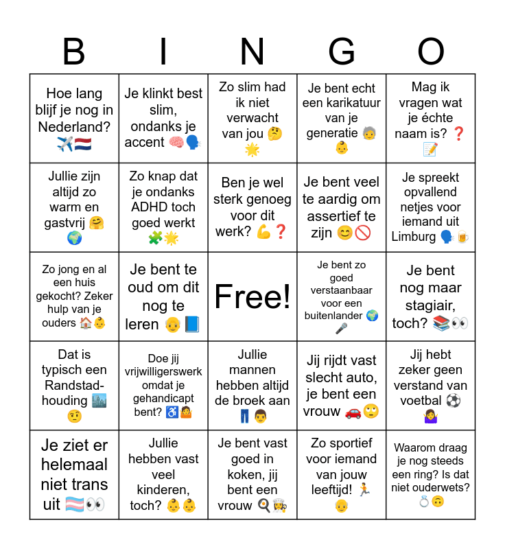 This bingo card has a free space and 25 words: Doe jij vrijwilligerswerk omdat je gehandicapt bent? βΏπ€·, Je bent vast goed in koken, jij bent een vrouw π³π©βπ³, Ben je wel sterk genoeg voor dit werk? πͺβ, Je ziet er helemaal niet trans uit π³οΈββ§οΈπ, Mag ik vragen wat je Γ©chte naam is? βπ, Hoe lang blijf je nog in Nederland? βοΈπ³π±, Jullie zijn altijd zo warm en gastvrij π€π, Je klinkt best slim, ondanks je accent π§ π£οΈ, Je bent zo goed verstaanbaar voor een buitenlander ππ€, Jullie mannen hebben altijd de broek aan ππ¨, Je bent veel te aardig om assertief te zijn ππ«, Zo jong en al een huis gekocht? Zeker hulp van je ouders π πΆ, Jij rijdt vast slecht auto, je bent een vrouw ππ, Jij hebt zeker geen verstand van voetbal β½π€·ββοΈ, Zo knap dat je ondanks ADHD toch goed werkt π§©π, Jullie generatie is lui π±π΄, Je bent nog maar stagiair, toch? ππ, Zo slim had ik niet verwacht van jou π€π, Je spreekt opvallend netjes voor iemand uit Limburg π£οΈπΊ, Je bent te oud om dit nog te leren π΄π, Waarom draag je nog steeds een ring? Is dat niet ouderwets? ππ, Jullie hebben vast veel kinderen, toch? πΆπΆ, Dat is typisch een Randstad-houding ποΈπ€¨, Je bent echt een karikatuur van je generatie π§πΆ and Zo sportief voor iemand van jouw leeftijd! ππ΄.