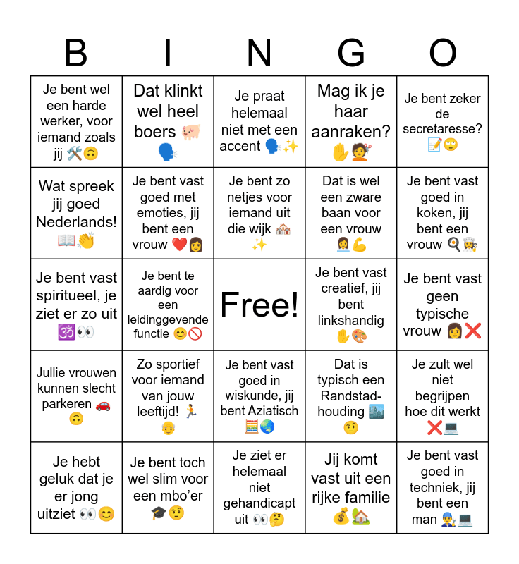 This bingo card has a free space and 25 words: Zo sportief voor iemand van jouw leeftijd! ๐๐ด, Je ziet er helemaal niet gehandicapt uit ๐๐ค, Je bent zo netjes voor iemand uit die wijk ๐๏ธโจ, Je hebt geluk dat je er jong uitziet ๐๐, Je bent zeker de secretaresse? ๐๐, Je bent wel een harde werker, voor iemand zoals jij ๐ ๏ธ๐, Wat spreek jij goed Nederlands! ๐๐, Dat klinkt wel heel boers ๐๐ฃ๏ธ, Je bent vast creatief, jij bent linkshandig โ๐จ, Je bent vast goed in wiskunde, jij bent Aziatisch ๐งฎ๐, Dat is wel een zware baan voor een vrouw ๐ฉโ๐ผ๐ช, Je bent vast spiritueel, je ziet er zo uit ๐๏ธ๐, Dat is typisch een Randstad-houding ๐๏ธ๐คจ, Je zult wel niet begrijpen hoe dit werkt โ๐ป, Je bent vast goed met emoties, jij bent een vrouw โค๏ธ๐ฉ, Wanneer ga je kinderen krijgen? ๐ถ๐ค, Je bent vast geen typische vrouw ๐ฉโ, Je praat helemaal niet met een accent ๐ฃ๏ธโจ, Je bent vast goed in koken, jij bent een vrouw ๐ณ๐ฉโ๐ณ, Je bent te aardig voor een leidinggevende functie ๐๐ซ, Je bent vast goed in techniek, jij bent een man ๐จโ๐ง๐ป, Je bent toch wel slim voor een mboโer ๐๐คจ, Jullie vrouwen kunnen slecht parkeren ๐๐, Mag ik je haar aanraken? โ๐ and Jij komt vast uit een rijke familie ๐ฐ๐ก.