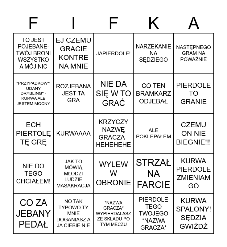 This bingo card has a free space and 29 words: CO ZA JEBANY PEDAŁ, NIE NO TA GRA JEST SPIERDOLONA, KURWAAAA, JAKI KURWA SPALONY?!, TO JEST POJEBANE-TWÓJ BRONI WSZYSTKO A MÓJ NIC, JAPIERDOLE!, ROZJEBANA JEST TA GRA, JAK TO MÓWIĄ MŁODZI LUDZIE MASAKRACJA, ALE POKLEPAŁEM, NO TAK TYPOWO TY MNIE DOGANIASZ A JA CIEBIE NIE, CZEMU ON NIE BIEGNIE!!!, KURWA SPALONY! SĘDZIA GWIŻDŻ, *NAZWA GRACZA* WYPIERDALASZ ZE SKŁADU PO TYM MECZU, PIERDOLE TEGO TWOJEGO *NAZWA GRACZA*, PIERDOLE TO GRANIE, JAPIERDOLE JAK TO WESZŁO, WYLEW W OBRONIE, NIE DO TEGO CHCIAŁEM!, NASTĘPNEGO GRAM NA POWAŻNIE, ECH PIERTOLĘ TĘ GRĘ, STRZAŁ NA FARCIE, CZEMU ON KURWA NIE BIEGNIE, CO TEN BRAMKARZ ODJEBAŁ, *PRZYPADKOWY UDANY DRYBLING* - KURWA ALE JESTEM MOCNY, NARZEKANIE NA SĘDZIEGO, EJ CZEMU GRACIE KONTRE NA MNIE, KURWA PIERDOLE ZMIENIAM GO, NIE DA SIĘ W TO GRAĆ and CZEMU ON JEST TAKI SZYBKI?!.