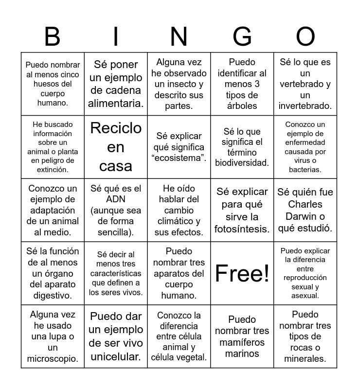 This bingo card has 25 words: Sé decir al menos tres características que definen a los seres vivos., Conozco la diferencia entre célula animal y célula vegetal., Sé explicar qué significa “ecosistema”., Alguna vez he usado una lupa o un microscopio., Sé lo que es un vertebrado y un invertebrado., Puedo nombrar al menos cinco huesos del cuerpo humano., He buscado información sobre un animal o planta en peligro de extinción., Sé poner un ejemplo de cadena alimentaria., Sé explicar para qué sirve la fotosíntesis., Puedo nombrar tres aparatos del cuerpo humano., Sé lo que significa el término biodiversidad., Conozco un ejemplo de adaptación de un animal al medio., Free!, Puedo explicar la diferencia entre reproducción sexual y asexual., Reciclo en casa, Puedo nombrar tres tipos de rocas o minerales., Sé quién fue Charles Darwin o qué estudió., Alguna vez he observado un insecto y descrito sus partes., Conozco un ejemplo de enfermedad causada por virus o bacterias., Sé qué es el ADN (aunque sea de forma sencilla)., He oído hablar del cambio climático y sus efectos., Puedo dar un ejemplo de ser vivo unicelular., Sé la función de al menos un órgano del aparato digestivo., Puedo identificar al menos 3 tipos de árboles and Puedo nombrar tres mamíferos marinos.