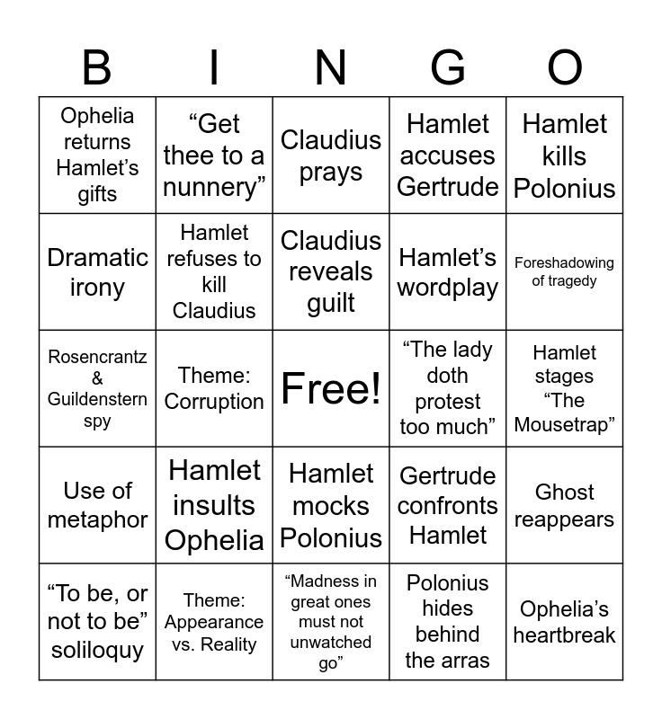 This bingo card has a free space and 24 words: “To be, or not to be” soliloquy, Hamlet insults Ophelia, Claudius reveals guilt, Polonius hides behind the arras, Hamlet kills Polonius, Ophelia returns Hamlet’s gifts, “Get thee to a nunnery”, Claudius prays, “The lady doth protest too much”, Hamlet stages “The Mousetrap”, Rosencrantz & Guildenstern spy, Hamlet refuses to kill Claudius, Gertrude confronts Hamlet, Ghost reappears, Dramatic irony, Theme: Appearance vs. Reality, “Madness in great ones must not unwatched go”, Hamlet accuses Gertrude, Foreshadowing of tragedy, Use of metaphor, Theme: Corruption, Hamlet mocks Polonius, Hamlet’s wordplay and Ophelia’s heartbreak.