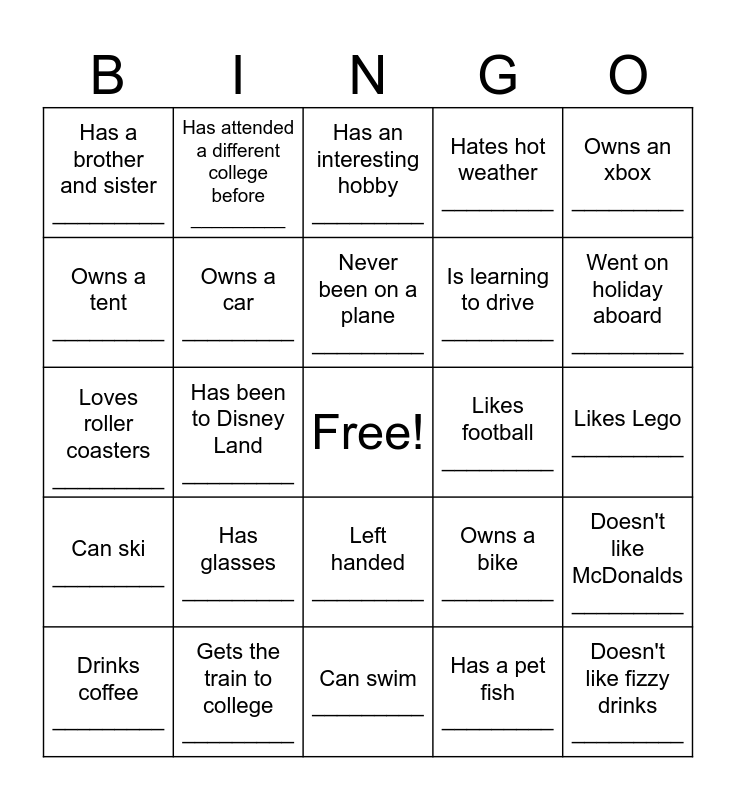 This bingo card has a free space and 24 words: Has glasses _________, Gets the train to college _________, Never been on a plane _________, Drinks coffee _________, Owns an xbox _________, Has a brother and sister _________, Owns a tent _________, Has attended a different college before _________, Likes football _________, Left handed _________, Is learning to drive _________, Loves roller coasters _________, Owns a bike _________, Doesn't like McDonalds _________, Owns a car _________, Has a pet fish _________, Likes Lego _________, Has an interesting hobby _________, Went on holiday aboard _________, Has been to Disney Land _________, Doesn't like fizzy drinks _________, Can ski _________, Hates hot weather _________ and Can swim _________.