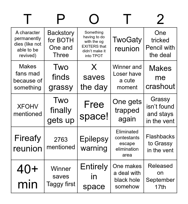 This bingo card has a free space and 50 words: Filler episode, Released on September 17th, Shows the deal one made with leafy, Entirely in space, 2763 mentioned, No cake at stake, Backstory for BOTH One and Three, Makes me cry, Makes fans mad because of something, Bottle gets saved, Two finds grassy, TwoGaty reunion, Flashbacks to Grassy in the vent, Eliminated contestants escape elimination area, One ruins everything, Moon gets blown up, X saves the day, One gets trapped again, Related to TPOT 18, One tricked Pencil with the deal, Two finally gets up, One makes a deal with black hole somehow, A character permanently dies (like not able to be revived), Winner and Loser have a cute moment, Winner and Loser save the day, Overall disappointing, Makes me crashout, Six and the gang escape the EXIT, Something having to do with the og EXITERS that didn’t make it into TPOT, Epilepsy warning, I have to pause multiple times to process, Failed Debuters somehow come back, Jacknjelly get hated on for the ep not meeting expectations, Ep doesn’t meet expectations, Winner saves Taggy first, 2 new characters get erased from timeline, Algebraliens other than One, Two, Three, Four, X, and Six show up, not just mentioned, SHOW UP, One gets defeated, Pencil actually gets the chance to fix her past.. (boring, yawn), Grassy isn’t found and stays in the vent, Grassy finds his own way out of the vent, and panics because nobody is around, One makes a deal with Grassy., Episode is premiered instead of regularly released, The contestants who get saved die again, 40+ min, XFOHV mentioned, Adult jokes, Related to space (thumbnail is space themed), Fireafy reunion and The win token thing comes in handy.