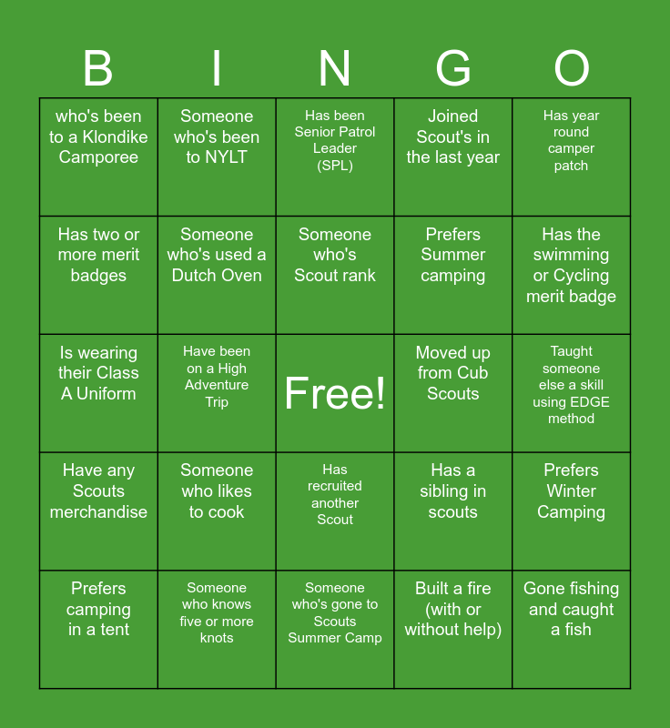 This bingo card has a free space and 24 words: Someone who likes to cook, Someone who knows five or more knots, Someone who's Scout rank, Prefers camping in a tent, Has year round camper patch, who's been to a Klondike Camporee, Has two or more merit badges, Someone who's been to NYLT, Moved up from Cub Scouts, Has recruited another Scout, Prefers Summer camping, Is wearing their Class A Uniform, Has a sibling in scouts, Prefers Winter Camping, Someone who's used a Dutch Oven, Built a fire (with or without help), Taught someone else a skill using EDGE method, Has been Senior Patrol Leader (SPL), Has the swimming or Cycling merit badge, Have been on a High Adventure Trip, Gone fishing and caught a fish, Have any Scouts merchandise, Joined Scout's in the last year and Someone who's gone to Scouts Summer Camp.