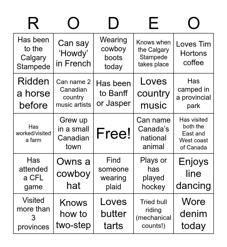 This bingo card has a free space and 24 words: Owns a cowboy hat, Knows how to two-step, Has been to Banff or Jasper, Visited more than 3 provinces, Loves Tim Hortons coffee, Has been to the Calgary Stampede, Ridden a horse before, Can say ‘Howdy’ in French, Can name Canada’s national animal, Find someone wearing plaid, Loves country music, Has worked/visited a farm, Plays or has played hockey, Enjoys line dancing, Can name 2 Canadian country music artists, Tried bull riding (mechanical counts!), Has visited both the East and West coast of Canada, Wearing cowboy boots today, Has camped in a provincial park, Grew up in a small Canadian town, Wore denim today, Has attended a CFL game, Knows when the Calgary Stampede takes place and Loves butter tarts.