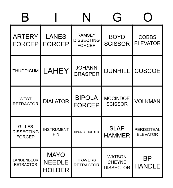 This bingo card has a free space and 24 words: INSTRUMENT PIN, MAYO NEEDLE HOLDER, JOHANN GRASPER, LANGENBECK RETRACTOR, COBBS ELEVATOR, ARTERY FORCEP, THUDDICUM, LANES FORCEP, MCCINDOE SCISSOR, SPONGEHOLDER, DUNHILL, WEST RETRACTOR, SLAP HAMMER, PERISOTEAL ELEVATOR, LAHEY, WATSON CHEYNE DISSECTOR, VOLKMAN, RAMSEY DISSECTING FORCEP, CUSCOE, DIALATOR, BP HANDLE, GILLES DISSECTING FORCEP, BOYD SCISSOR and TRAVERS RETRACTOR.