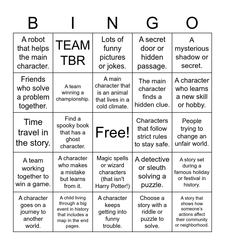 This bingo card has a free space and 24 words: A character who makes a mistake but learns from it., A child living through a big event in history that includes a map in the end pages., A main character that is an animal that lives in a cold climate., A character goes on a journey to another world., A mysterious shadow or secret., A robot that helps the main character., Friends who solve a problem together., TEAM TBR, Characters that follow strict rules to stay safe., Magic spells or wizard characters (that isn't Harry Potter!), The main character finds a hidden clue., Time travel in the story., A detective or sleuth solving a puzzle., A story set during a famous holiday or festival in history., A team winning a championship., Choose a story with a riddle or puzzle to solve., People trying to change an unfair world., Lots of funny pictures or jokes., A character who learns a new skill or hobby., Find a spooky book that has a ghost character., A story that shows how someone’s actions affect their community or neighborhood., A team working together to win a game., A secret door or hidden passage. and A character keeps getting into funny trouble..