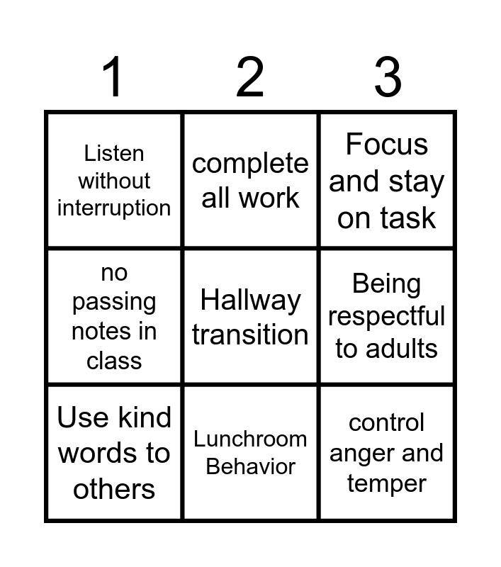 This bingo card has a free space and 8 words: Being respectful to adults, Focus and stay on task, complete all work, Use kind words to others, Listen without interruption, control anger and temper, no passing notes in class and Lunchroom Behavior.