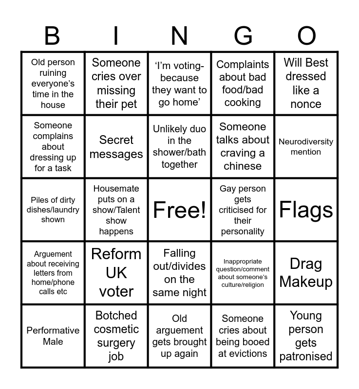 This bingo card has a free space and 24 words: Reform UK voter, Botched cosmetic surgery job, Unlikely duo in the shower/bath together, Performative Male, Will Best dressed like a nonce, Old person ruining everyone’s time in the house, Someone complains about dressing up for a task, Someone cries over missing their pet, Gay person gets criticised for their personality, Falling out/divides on the same night, Someone talks about craving a chinese, Piles of dirty dishes/laundry shown, Inappropriate question/comment about someone’s culture/religion, Drag Makeup, Secret messages, Someone cries about being booed at evictions, Flags, ‘I’m voting- because they want to go home’, Neurodiversity mention, Housemate puts on a show/Talent show happens, Young person gets patronised, Arguement about receiving letters from home/phone calls etc, Complaints about bad food/bad cooking and Old arguement gets brought up again.