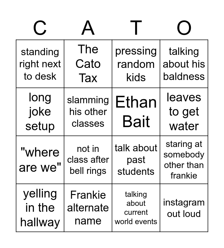 This bingo card has 36 words: Free!, "I love my wife", "wheres youre friend", Ethan Bait, talking about his glut, instagram out loud, leaves to get water, "im a jerk", long joke setup, clearing throat for long, staring at somebody other than frankie, talking about his baldness, McCurrrrllleeeeyyyyy, Frankie alternate name, not in class after bell rings, standing right next to desk, "Do you have your phone", Cavalero walks in, yelling in the hallway, pressing random kids, talking about current world events, holy yammering, talks about his daughter, talks about video games, talk about some sort of automobile, The Cato Tax, talk about past students, on the phone, "where are we", slamming his other classes, 45 or 92, "get busy", "alright", general dad noise, baited into a lecture and leaves to go to the bathroom.