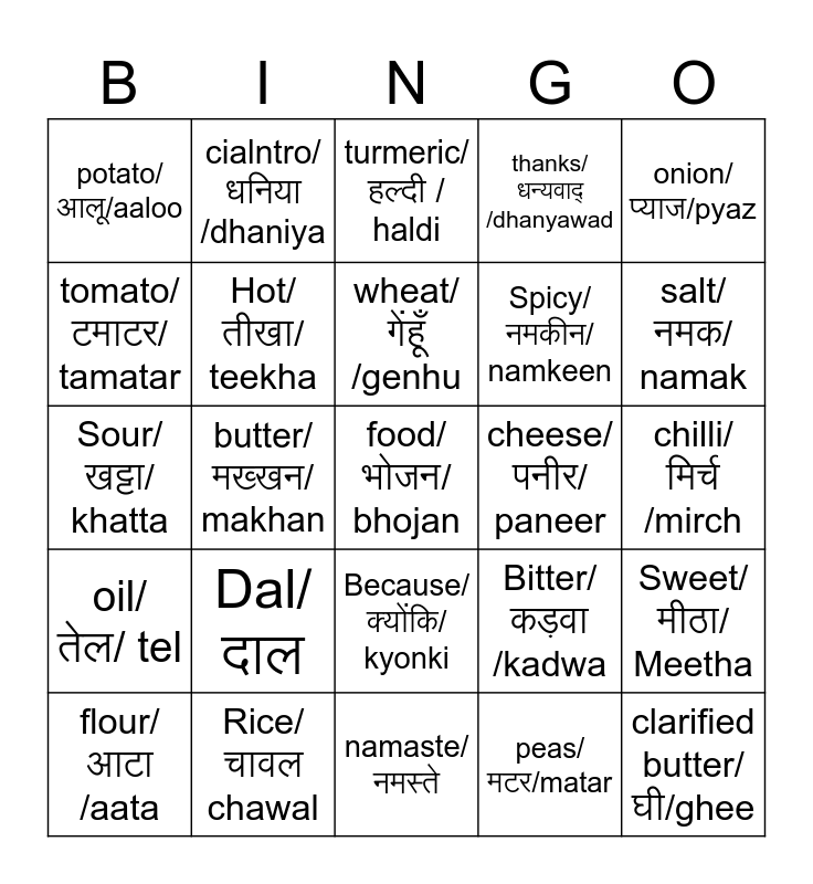 This bingo card has a free space and 24 words: Dal/दाल, Rice/चावल chawal, wheat/गेंहूँ /genhu, flour/आटा /aata, onion/प्याज/pyaz, potato/आलू/aaloo, tomato/टमाटर/ tamatar, cialntro/धनिया /dhaniya, cheese/पनीर/ paneer, Because/ क्योंकि/ kyonki, Spicy/ नमकीन/ namkeen, Sour/खट्टा/ khatta, Bitter/ कड़वा /kadwa, Sweet/ मीठा/ Meetha, Hot/ तीखा/ teekha, peas/ मटर/matar, chilli/ मिर्च /mirch, turmeric/हल्दी / haldi, salt/ नमक/ namak, butter/ मख्खन/ makhan, clarified butter/ घी/ghee, oil/ तेल/ tel, thanks/धन्यवाद् /dhanyawad and namaste/नमस्ते.