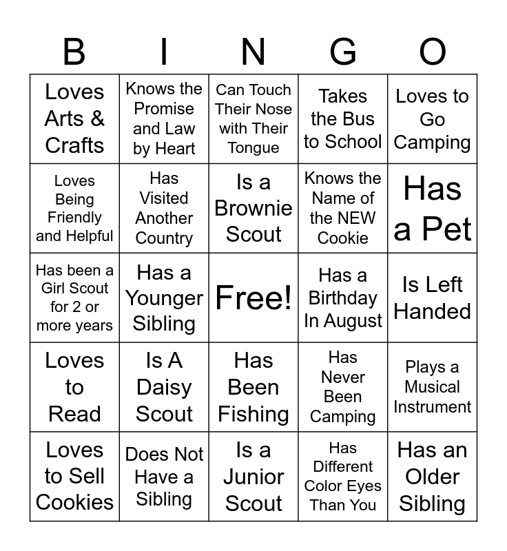 This bingo card has a free space and 25 words: Is A Daisy Scout, Is a Junior Scout, Is a Brownie Scout, Loves to Sell Cookies, Loves to Go Camping, Loves Arts & Crafts, Loves Being Friendly and Helpful, Knows the Promise and Law by Heart, Has a Birthday In August, Has Been Fishing, Knows the Name of the NEW Cookie, Has been a Girl Scout for 2 or more years, Has Never Been Camping, Plays a Musical Instrument, Has Visited Another Country, Speaks More than 1 Language, Is Left Handed, Can Touch Their Nose with Their Tongue, Has a Pet, Has a Younger Sibling, Has an Older Sibling, Does Not Have a Sibling, Loves to Read, Takes the Bus to School and Has Different Color Eyes Than You.