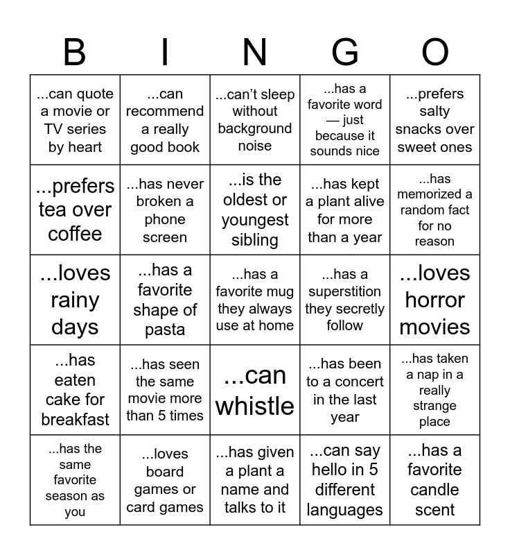 This bingo card has a free space and 24 words: ...has seen the same movie more than 5 times, ...loves board games or card games, ...is the oldest or youngest sibling, ...has the same favorite season as you, ...prefers salty snacks over sweet ones, ...can quote a movie or TV series by heart, ...prefers tea over coffee, ...can recommend a really good book, ...has a superstition they secretly follow, ...can whistle, ...has kept a plant alive for more than a year, ...loves rainy days, ...has been to a concert in the last year, ...has taken a nap in a really strange place, ...has never broken a phone screen, ...can say hello in 5 different languages, ...loves horror movies, ...can’t sleep without background noise, ...has memorized a random fact for no reason, ...has a favorite shape of pasta, ...has a favorite candle scent, ...has eaten cake for breakfast, ...has a favorite word — just because it sounds nice and ...has given a plant a name and talks to it.