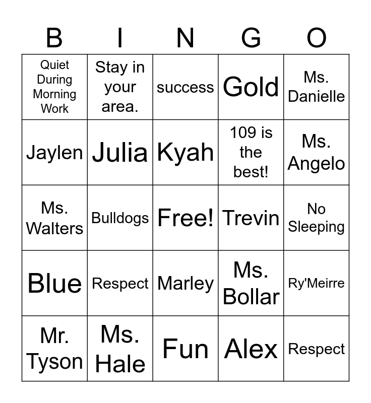 This bingo card has a free space and 24 words: Respect, Ms. Hale, Kyah, Mr. Tyson, Ms. Danielle, Quiet During Morning Work, Jaylen, Stay in your area., Trevin, Marley, 109 is the best!, Ms. Walters, Ms. Bollar, Ry'Meirre, Julia, Alex, No Sleeping, success, Ms. Angelo, Bulldogs, Respect, Blue, Gold and Fun.