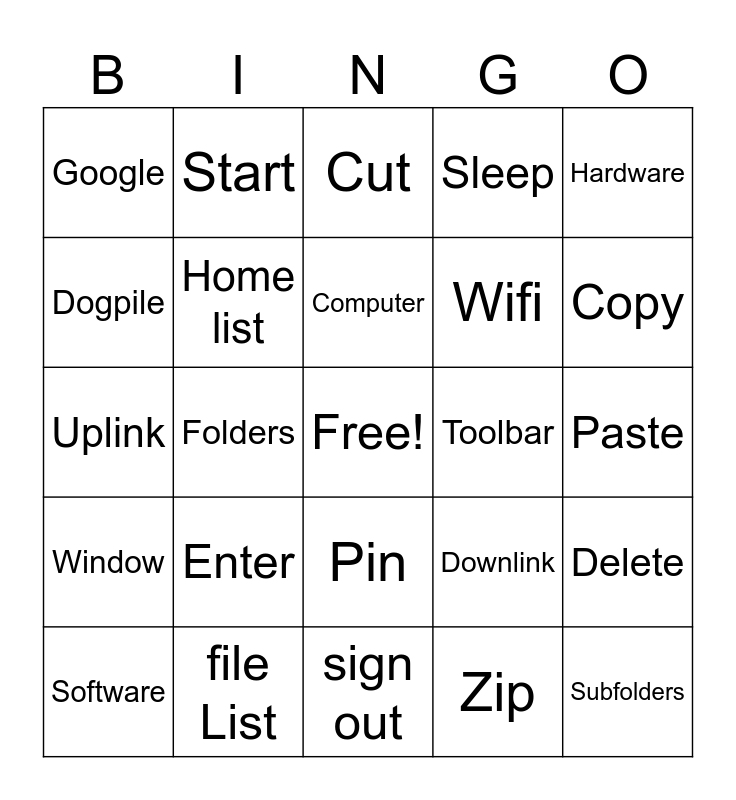 This bingo card has a free space and 24 words: Enter, file List, Computer, Software, Hardware, Google, Dogpile, Start, Toolbar, Pin, Wifi, Uplink, Downlink, Delete, Home list, Zip, Paste, Cut, Copy, Folders, Subfolders, Window, Sleep and sign out.