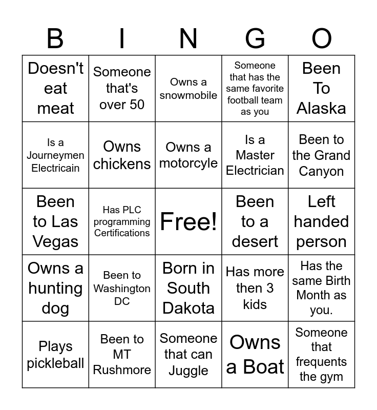 This bingo card has a free space and 34 words: Born in Minnesota, Owns a Boat, Someone's birthday that is today, Born in Wyoming, Owns a hunting dog, Owns chickens, Been To Alaska, Plays pickleball, Someone that's over 50, Someone that's under 25, Owns a motorcyle, Owns a snowmobile, Plays Hockey, Climbed a mountain, Been to a desert, Been to the Grand Canyon, Been to MT Rushmore, Been to Las Vegas, Been to Washington DC, Has more then 3 kids, Born in South Dakota, Doesn't drink coffee, Doesn't eat meat, Left handed person, Someone that can Juggle, Someone that frequents the gym, Someone that has the same favorite football team as you, Someone that chews their fingernails, Is a Master Electrician, Is a Journeymen Electricain, Is a Apprentice Electrician, Has PLC programming Certifications, Has the same Birth Month as you. and Has Sky Dived.