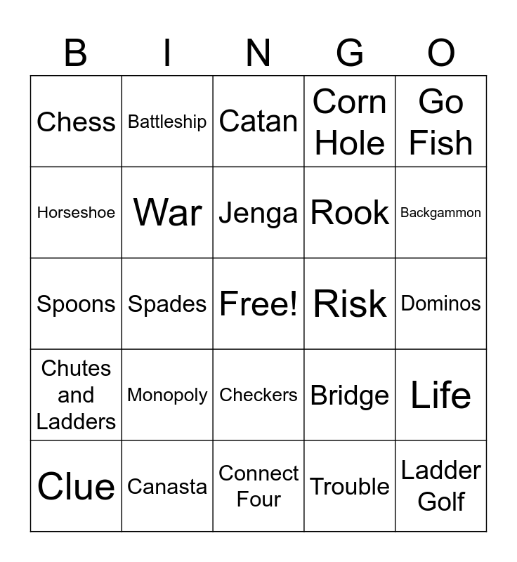 This bingo card has a free space and 37 words: Scrabble, Yahtzee, Uno, War, Life, Monopoly, Jenga, Rummy, Go Fish, Old Maid, Spades, Corn Hole, Ladder Golf, Dominos, Horseshoe, Chutes and Ladders, Candy Land, Catan, Checkers, Risk, Chess, Backgammon, Clue, Connect Four, Sorry!, Trouble, Battleship, Black Jack, Crazy Eights, Skippo, Parcheesi, Canasta, Spoons, Nertz, Bridge, Rook and Poker.